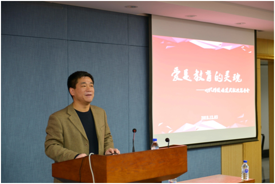 2018年12月3日,为响应学校在全校知识分子中深入开展“弘扬爱我奋斗精神、建功立业新时代”的号召,我院邀请教育部思想道德修养与法律基础课教学指导委员会副主任委员、国家哲学社会科学基金评审委员、国家万人计划教学名师、时代楷模、大连海事大学曲建武教授为全院教师作题为“爱是教育的灵魂”的专题报告。报告会由院党委书记周春国主持,院长蔡立东和班子成员、在校的教师和部分学生代表现场认真聆听了曲建武教授的感人事迹。