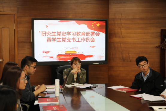 党委关于开展党史学习教育的工作要求,对研究生党史学习教育系列活动及学生党支部组织生活进行了相关部署。他提出,高校基层党组织是培养未来党内中坚力量的摇篮,在党的百年历史交汇关键点上,研究生各党支部应严格按照学校、学院的部署要求完成各项党史学习教育任务,将党史学习教育融入学生党员发展和培养教育工作,发展党员时应坚持高标准严要求,讲规范、讲质量、讲方法、讲态度,为向党组织输送具有吉大精神的青年人才提供组织保障。