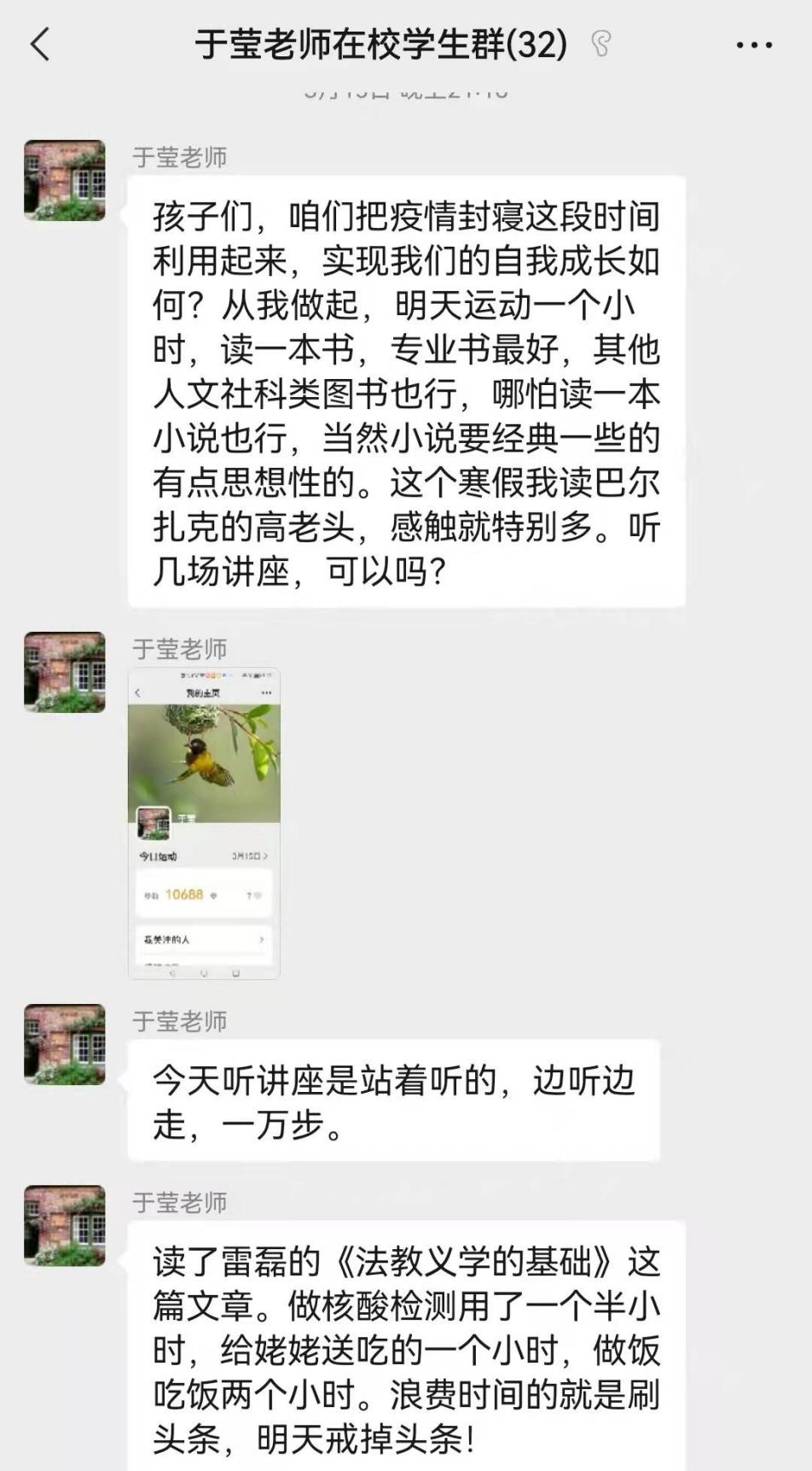 于莹老师也在这段特别的日子里,一直关心着师门同学的健康、心情和学习。在老师的带动下,每一个同学都在这段时期过得自律又充实。