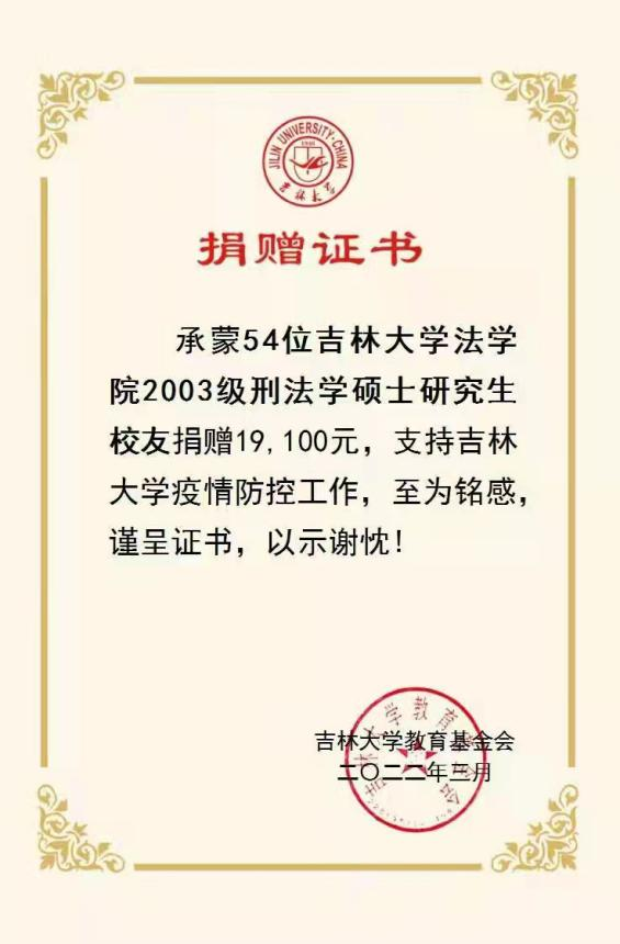 2003级刑法学硕士研究生一共54名同学,无论在校就读还是毕业之后一直都是一个团结的、充满正能量的集体,3月份以来一直心系母校,经过集体倡议和捐款行动,共募集人民币19100元,捐赠给母校,以此来表达同学们对母校抗疫工作的支持。”这段话摘自“吉大法学2003级刑法学硕士研究生全体校友的来信”,这是一封吉大人写给吉大的情书。而王军明正是这次捐款的组织者之一。