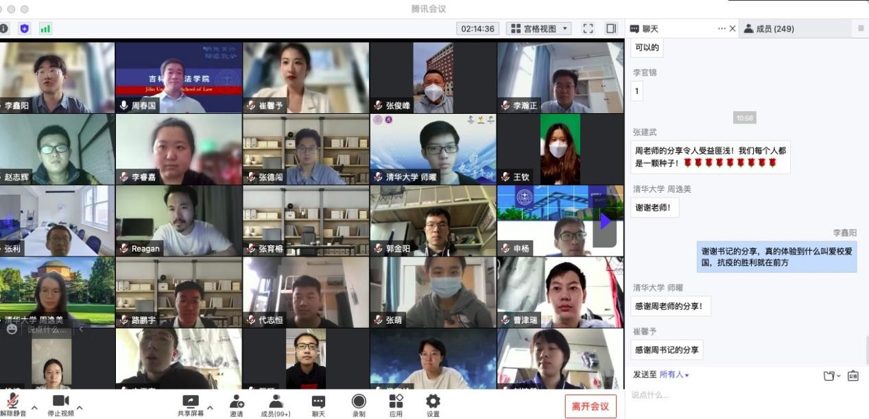 联合清华大学博士生讲师团在腾讯会议举行“云端战疫”思政课,对疫情期间涌现的广大志愿者的先进事迹和精神进行凝练总结。院党委书记周春国、党委副书记张俊峰、研究生辅导员徐晋、于洋,以及P站