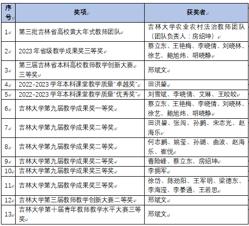 农业农村法治教师团队获得第三批吉林省高校黄大年式教师团队表彰;彭贵才教授、李洪祥教授获得从教40年荣誉徽章;蔡立东教授、王艳梅教授、李晓倩副教授、刘晓林教授、鲍旭炜老师、胡晓静教授共同获得2023年省级教学成果奖三等奖、P站