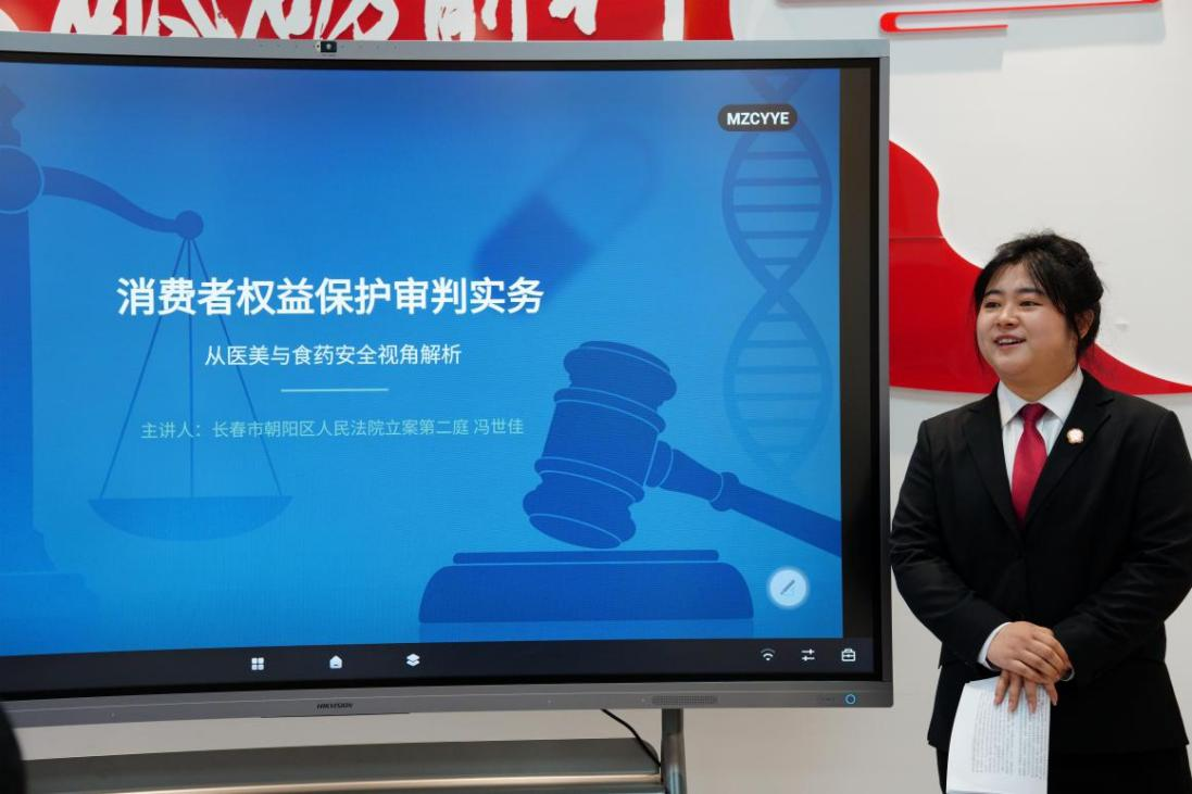 在新民社区,长春市朝阳区人民法院尹昱皓、冯世佳法官以“医疗美食,关乎你我”为主题,围绕《消费者权益保护法实施条例》展开深入解读,结合医疗美容、食品药品安全等领域的司法审判实务,通过以案释法的方式,帮助同学们识别消费陷阱、掌握维权方法,让法治为消费安全保驾护航。