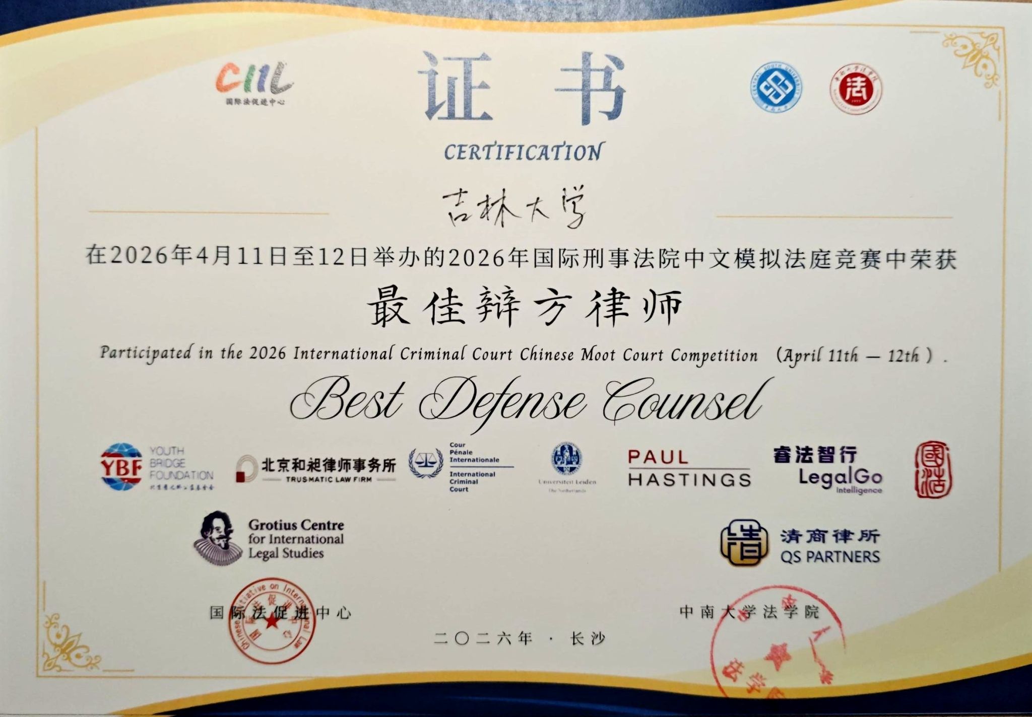 我院代表队凭借扎实的专业功底,在书状遴选阶段以总分第一名(并列)的优异成绩成功突围,晋级线下正赛阶段。在正赛中,经历了两天六场的激烈角逐,我院代表队最终荣获全国一等奖(第一名)、最佳庭辩奖、最佳辩护方书状奖、最佳辩方律师、最佳政府方代理人五项团体奖项,晋级海牙国际赛,再次刷新我院在此赛事中的历史最佳成绩。同时,我院本科生白若辰表现突出,荣获最佳辩护方庭辩奖。
